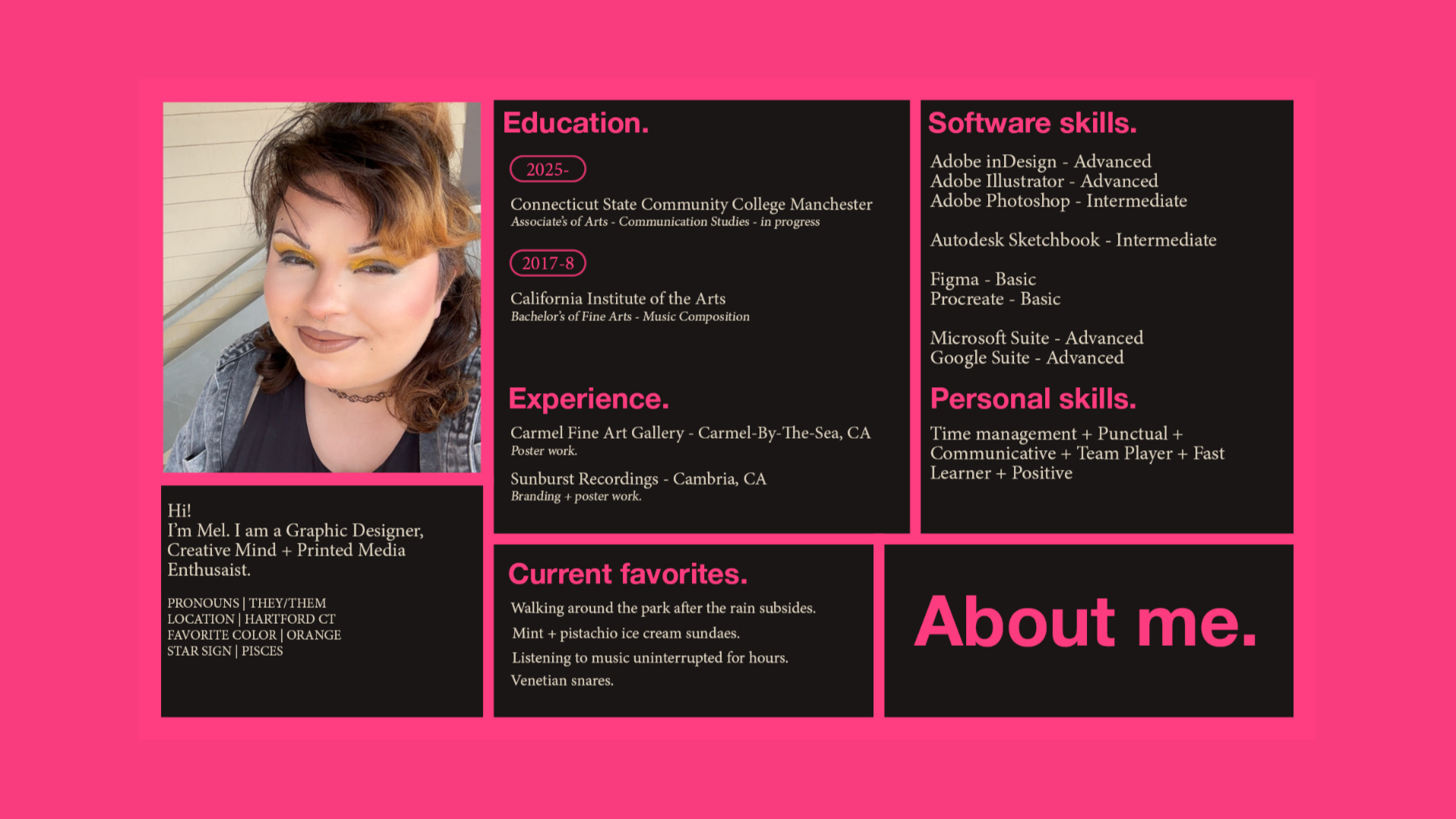 I specialize in crafting unique designs that blend playfulness with purpose, whether in print, digital, or DIY formats. When I’m not designing, you can find me making zines, exploring new creative mediums, or collaborating on community art projects.PRONOUNS | THEY/THEM