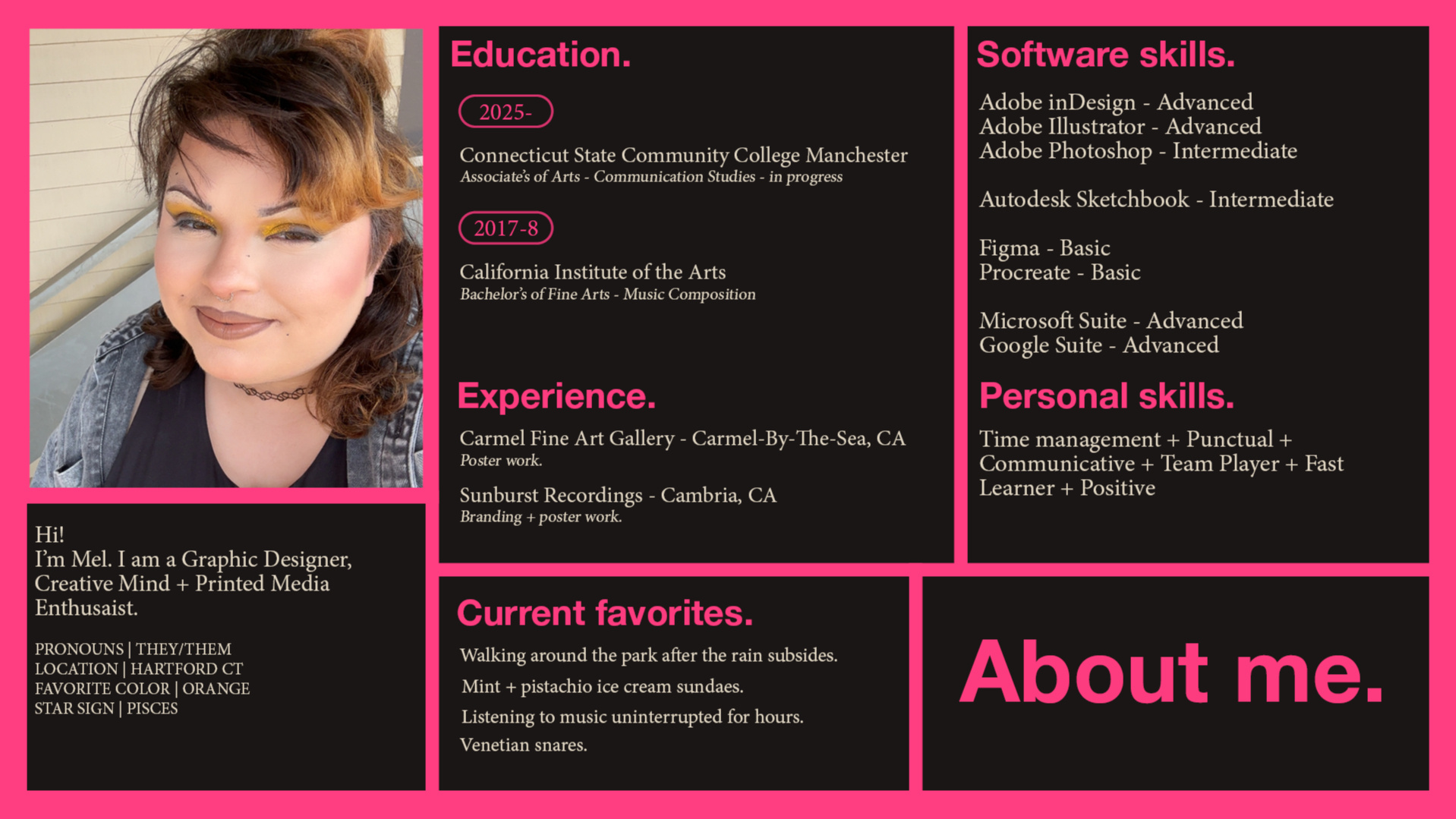 I specialize in crafting unique designs that blend playfulness with purpose, whether in print, digital, or DIY formats. When I’m not designing, you can find me making zines, exploring new creative mediums, or collaborating on community art projects.PRONOUNS | THEY/THEM